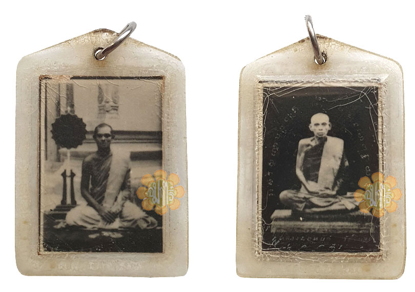 Image of Luang Phor Par and Luang Phor Yat in Black/White photo form "LoopThai" laminated on Glass and consecrated in year B.E. 2508 (1965). Luang Phor Yat was the founder and Abbot of Wat Bot ( Singburi Province )