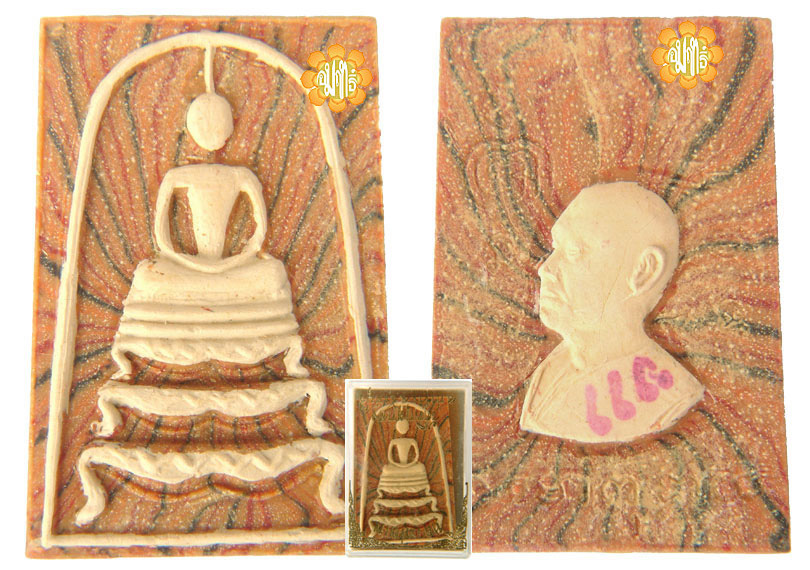 Made in Year B.E. 2540 by Luang Phor Pae, Taan Sin also known as Tok-Muu remade Buddha sitting on the 3 escalating placed tables Rainbow multi-coloured lines texture.
