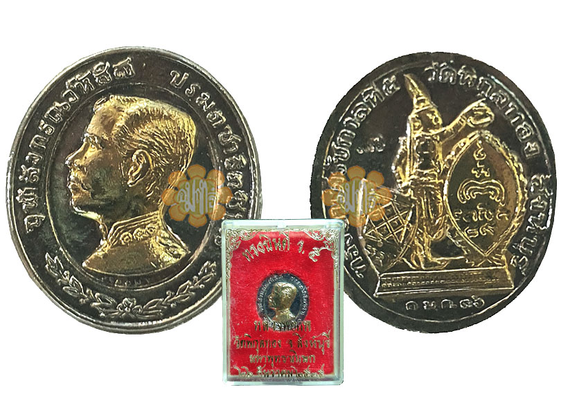 Raw Haa ( King Rama the Fifth ) phim Lek (Small Phim) was made and consecrated in year B.E. 2536 (1993) by Luang Phor Pae. This was made of Silver material and Gold Pasted on the King image. Original temple box.