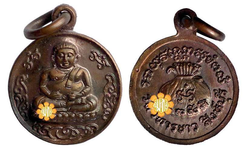 First Image of Sungkajai wealth amulet small round phim made in year B.E. 2518 (1975). Nat of Metal contends, The Buddha two hands of this amulets represent " keep Wealth " and one added money bag at the back of the amulet .