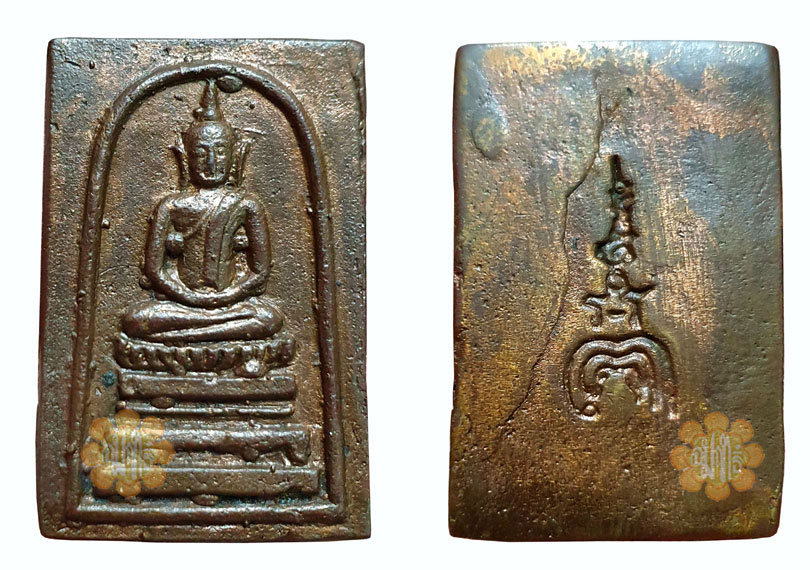 Phra Somdej Faa Baht (long ears) sitting on the lotus throne made by Luang Phor Pae in year B.E. 2503. Material was made from re-cycled used Aan ' Bowl ' which monks use to collect food in the morning. First batch of its kind and the second batch were made in year 2506 with a Bigger "yaan" inscripted at the back of the amulet. These phims were casted and not pressed.