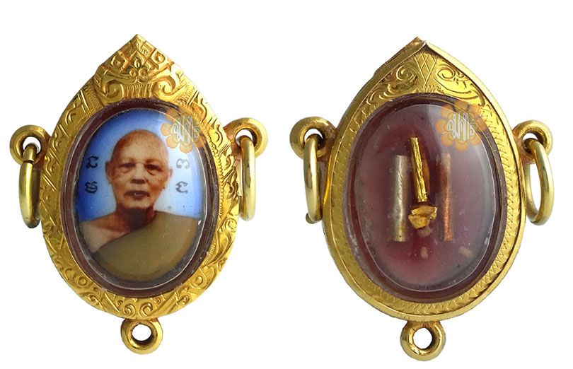 Image of Phra Luang Phor Pae ( Locket ) in coloured glazed Enamel amulet , Made in Year B.E. 2508 by Luang Phor Pae of Wat Pikul Thong. 1st Batch the back was pasted with the wax from the candle which was used during the " Putsik " ceremony . ( consecration ceremony ) Back encased with Gold,Silver & Nat Takruts.