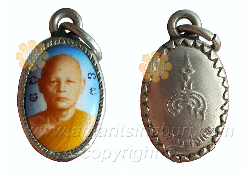 Image of Phra Luang Phor Pae (Small Locket ) in coloured glazed Enamel amulet , Made in Year B.E. 2508 consecrated by Luang Phor Pae of Wat Pikul Thong. 1st Batch the back was pasted with the wax of the candle which was used during the " Poksik " ceremony.