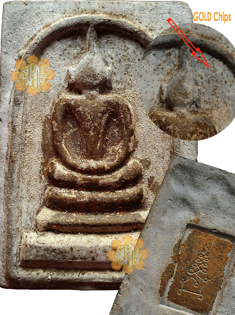 Embedded with Gold Chips in the front and chop with Quote at the back of the Somdej.
