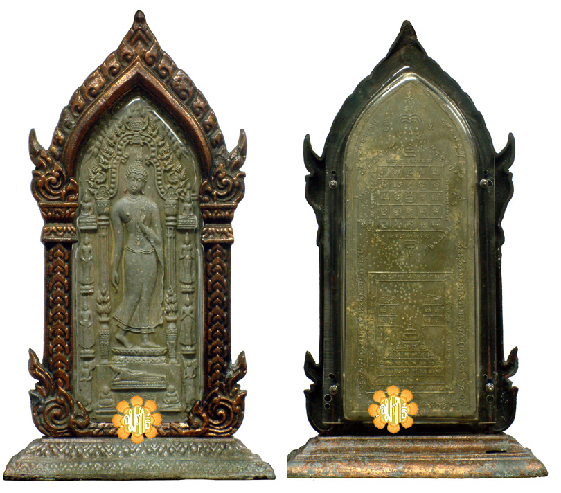 This Worshipping Image of Lilaa in slab form was made of Burnt Scriptures fron the temple (Bailan) from the temple and was consecrated by Luang Phor in year B.E. 2520. There were two models of this kind one of the other was made of Phoong (Beige colour). This casted frame was the original case made at that time for this image.