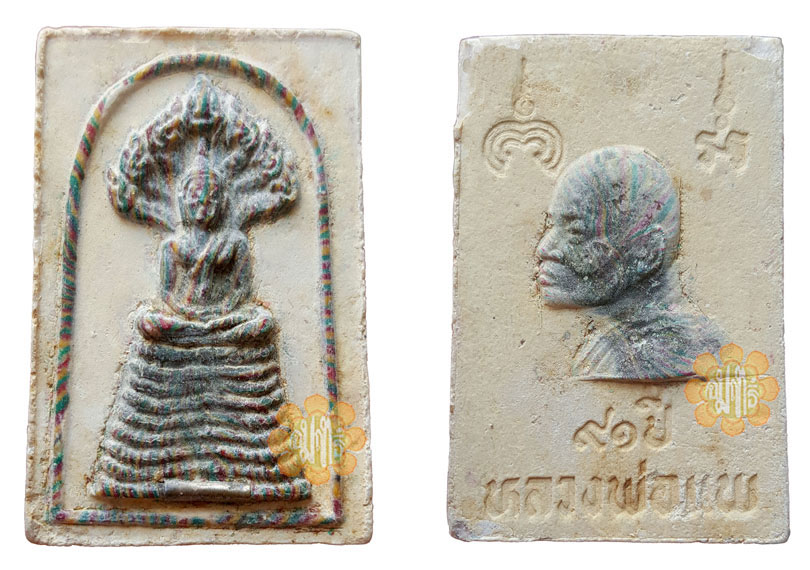 Phra Naa Prok was made in Year B.E.2539 (1996) by Luang Phor Pae when he was 91 years old , Image of a Buddha meditating with the protection of the Naga (a seven headed serpent). Materal white phoong with Linser coloured on the Bell and Buddha.