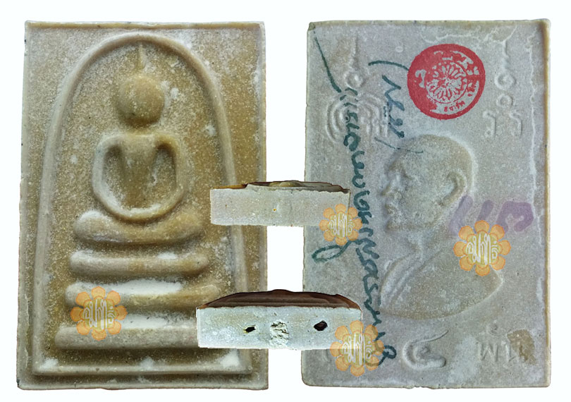 This Somdej was phim (pressed) with a 3 dots mould can be seen by both sides (Right & Left side ) of the amulet so-called by collectors as 1st batch. Phim Niyom. Gold Takrut embedded on the top of the Amulet and Silver & Nat Takrut below the Amulet. Specially full Signature Signed by Luang Phor