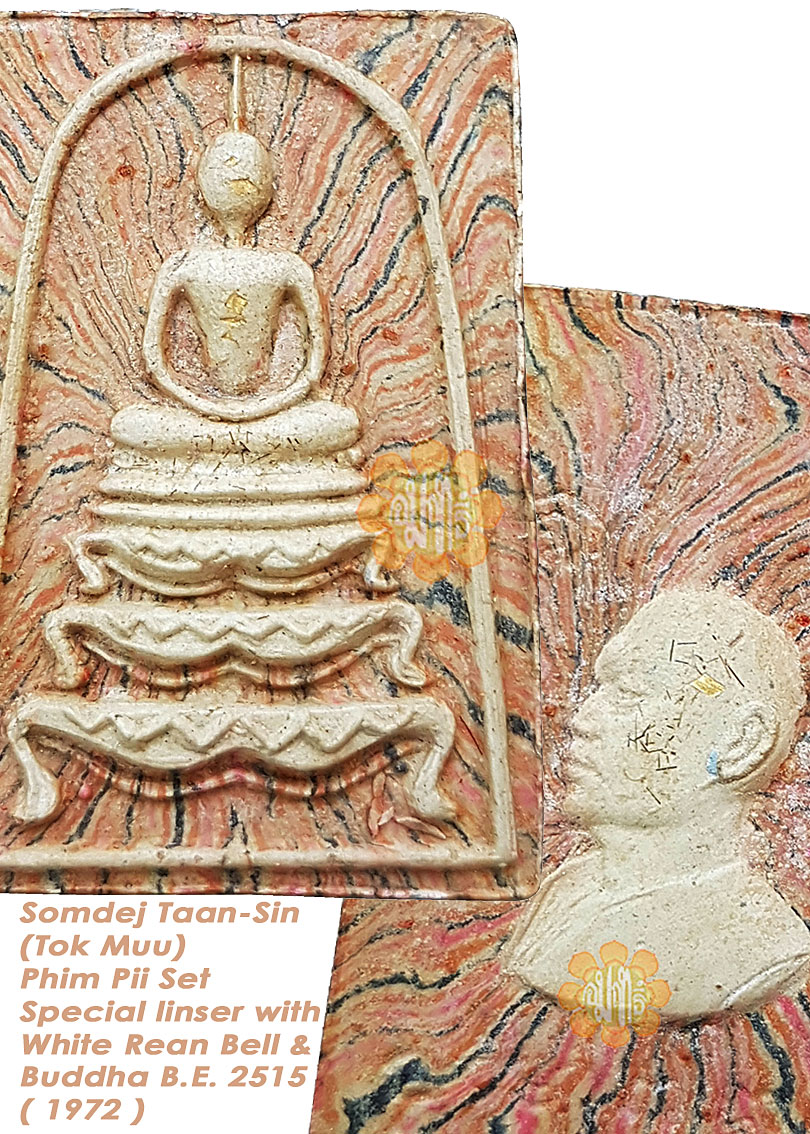 The above phims were made from rolled colour material technique Rainbow phim. With the white Buddha and White Bell on the three tables (Kaa Tok) known as " Phim PiiSet " in Thai language.