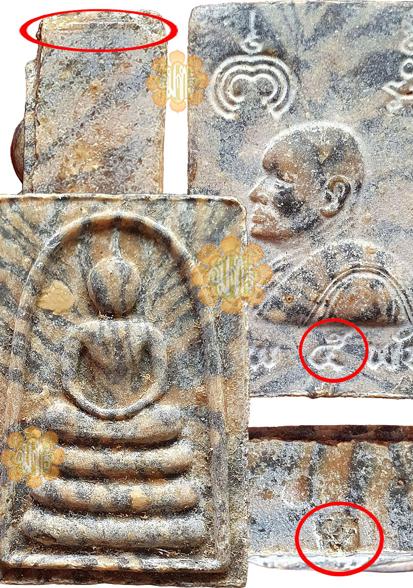 The top Left pic shows the Ream "Circled" of the Somdej had a " Marking" to define the original Block of this amulet made in year between B.E.2534/2535. The bloc marking at the bottom of the amulet too.