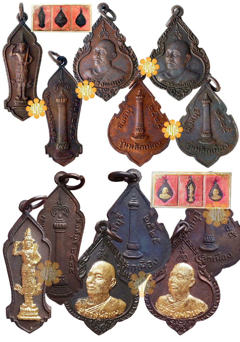 Nat of Metal contends. One set of these three amulets in original box, back were picture of the "Pillar" was the foundation of Singburi province.