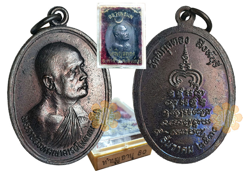 Images of Luang Phor Pae Rian made and consecrated in year B.E. 2530 (1987). Copper Oval medallion made to celebrate Luang Phor 80 year old Birthday.
