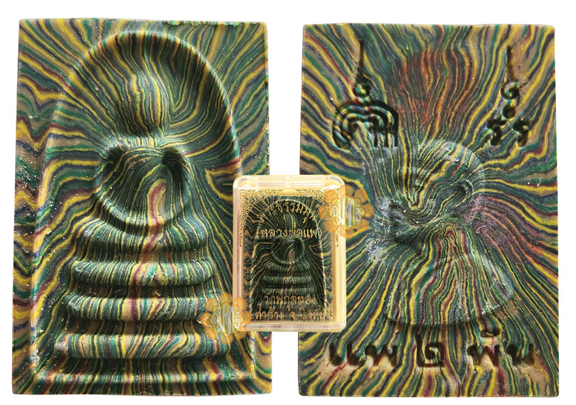 Made and consecrated in Year B.E. 2540 by Luang Phor Pae, A replica of Somdej Pae Sorng (2) Paan Linser with 3 takruts One gold on top . Material made of White phoong and Coloured ingredients. Mint and unworn condition.