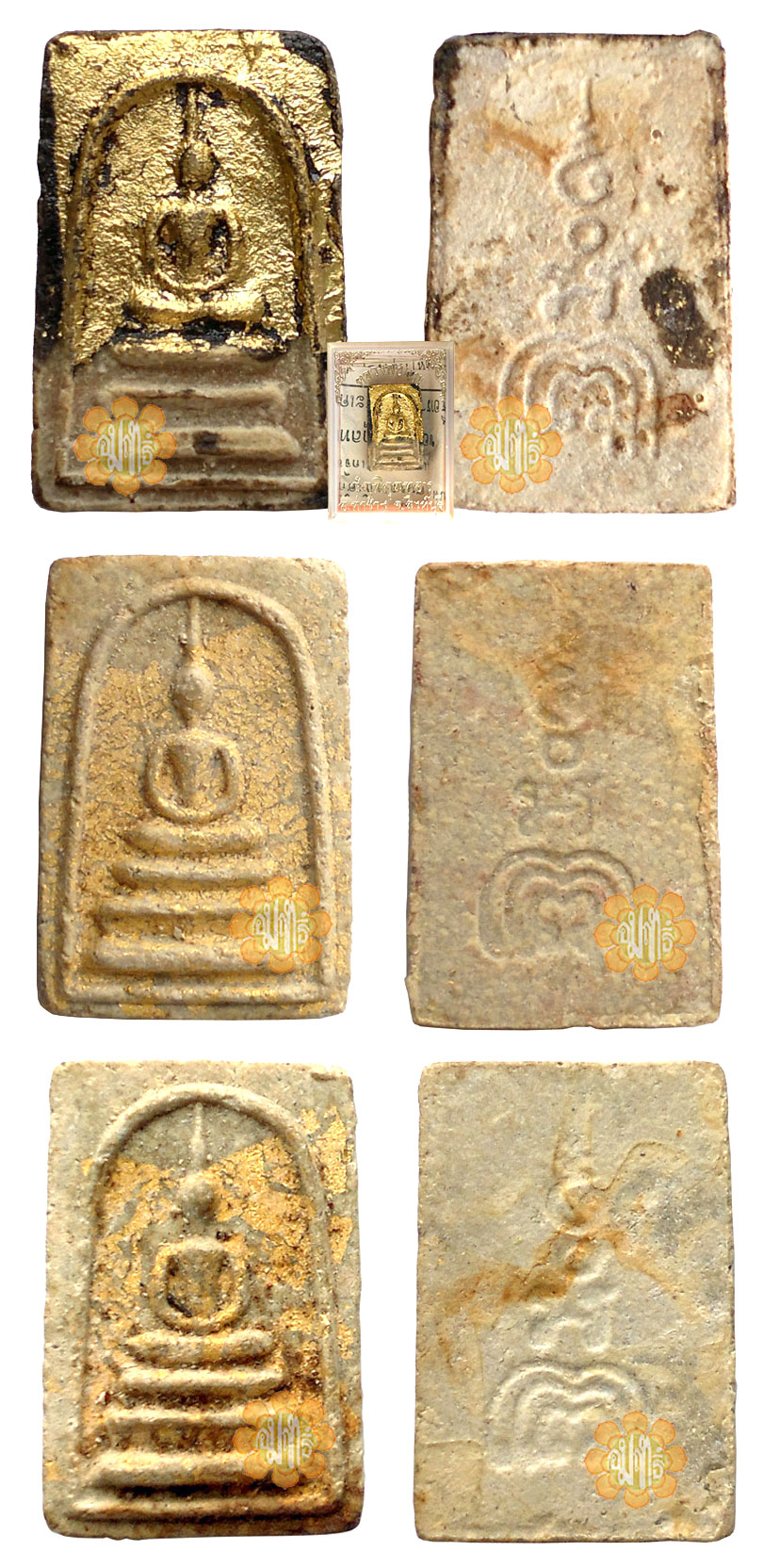 Made in year B.E. 2510 (1967). The first Somdej Kanean Luang Phor Pae made, and all were hand phim. most of these amulets have a single piece of square gold leave placed on the top of the material and were pressed together when making.