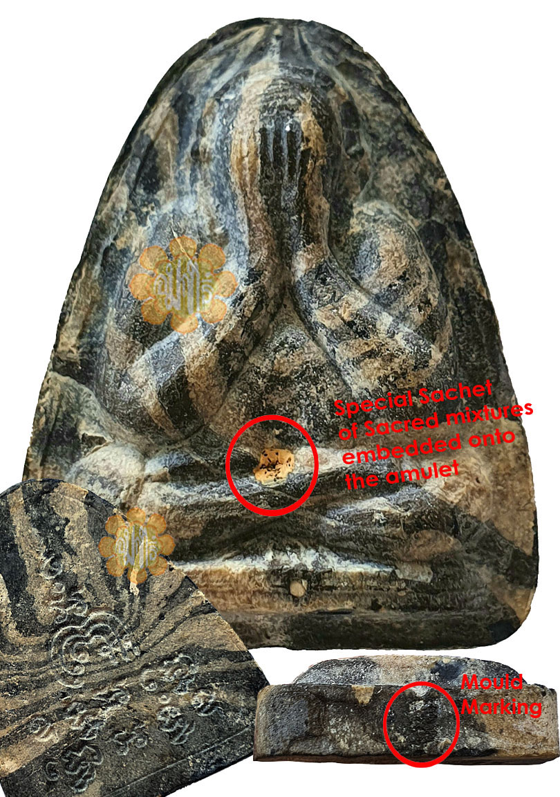 This phim was exceptional special as it has a " Sachet " circled Red embedded into the center of the Pidtaa . This Sachet was made from old leftover sacred mixture of special Phoong by Luang Phor.