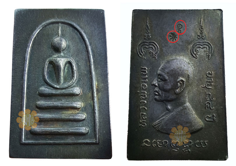 Image of Somdej and Back image of Luang Phor Pae made in year B.E. 2532 to commemorate Luang Phor Seventh Cycle of his live (84 yrs Old). Material made of Genuine Pure Antique Silver. Take note of the "Circles" Code at the back of the amulet.Made and consecrated by Luang Phor Pae. There were 2 more phim " Copper & Kalai Thong "