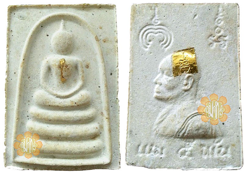 Made in Year B.E. 2535 this Very Special Somdej was consecrated by Luang Phor Pae. With genuine Gold foil pasted and phim at the same time during the making process. Signature by Luang Phor at the back of the amulet.