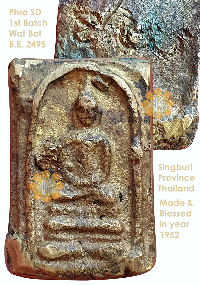 These very special Casted Genuine GOLD mixture with Nawat metal Phra Buddha Somdej was jointly consecrated by Chao Khun Sri, Luang Phoo Tok, Luang Phor Pae and other monks at Wat Bot (Singburi Province) in year B.E. 2495 (1952).