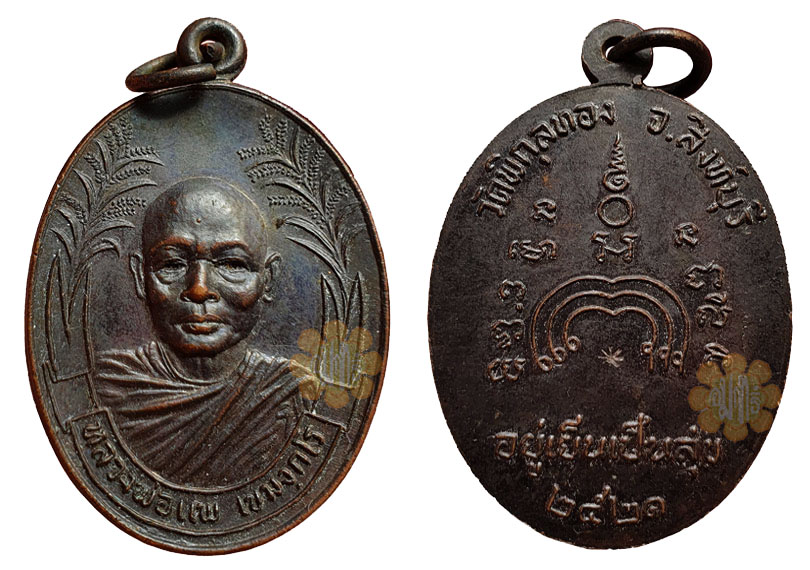 This metal oval shape " Happy-living Padi Ear Medallion " was described by the ancient reader. They were made by Luang Phor Pae of Wat Pikul Thong in year B.E. 2521.
