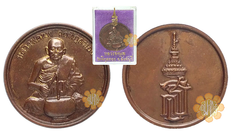 Images of Luang Phor Pae lightning candle to start " Pitti " consecration ceremony made in year B.E. 2536 (1993). Copper material Phim with Thai Queen Emblem at the back of the amulet.