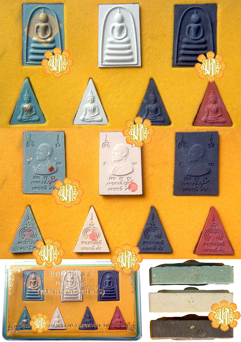 Somdej and Nangpaya Director mould set made specially by Luang Phor Pae in year B.E. 2539 (1996) embedded with Luang Phor hairs & gold foils and also the " Chiworn " Luang Phor cloth dress.