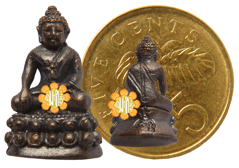Phra Chaiwat was a smaller replica version of Phra Kring made by Luang Phor Pae except there was no " ball-bearing " inside the amulet and it will not made any "kring" sound when shaken. In mint and unworn condition. Hereby compare the size with a Singapore Five cents coin.