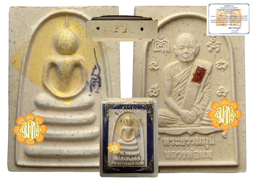 There was a piece of Sankati ( robe ofrmerly used by Luang Phor ) attached on the image at the back of the amulet. Hairs of Luang Phor and also with three takruts embedded into the amulet and with Itemize number : 59 engraved at the base of the amulet. Temple certificate of authenticity enclosed.
