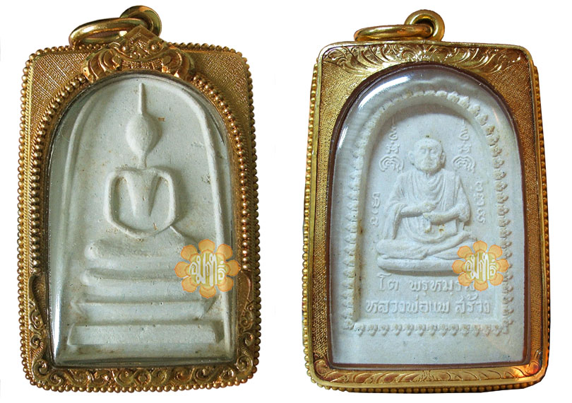 Somdej made with White Phoong material with Image of Phra Buddha Jaan To at the back of the amulet. The "taan" three steps where the Buddha was sitting were without the extra ( inserted lines). The above had gold chips and Luang Phor hairs mixed with the material when making.