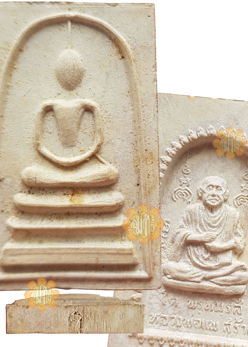 Somdej made with Sacred White Phoong material with Image of Phra Somdej Buddha Jaan To at the back of the amulet. The "taan" three steps where the Buddha was sitting were without the extra ( inserted lines). The above had gold chips and Luang Phor hairs mixed with the material when making.